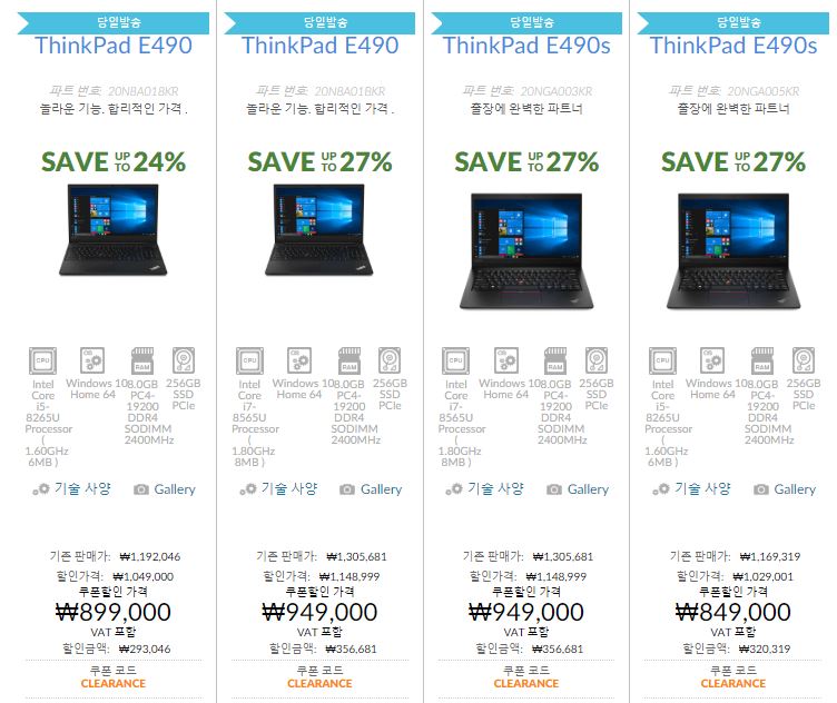 ThinkPad E490이 할인율 27% + 할인코드 5%를 적용하면