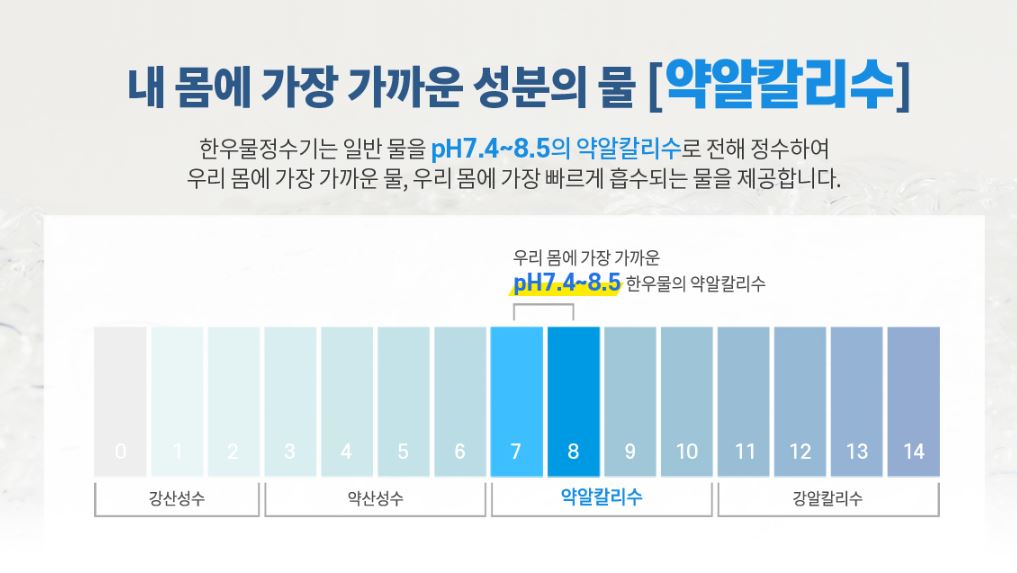 한우물정수기는 사람의 몸에 가장 가까운 pH7.4 ~ 8.5로의