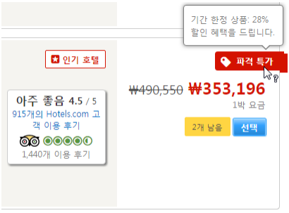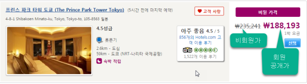 호텔스닷컴에 로그인 계정을 갖고계신 고객이라면 비밀특가로 예약할 수 있습니다. 표시가 있을경우 호텔스닷컴 회원에게만 공개되는 특가로 호텔을 예매할 수 있습니다.