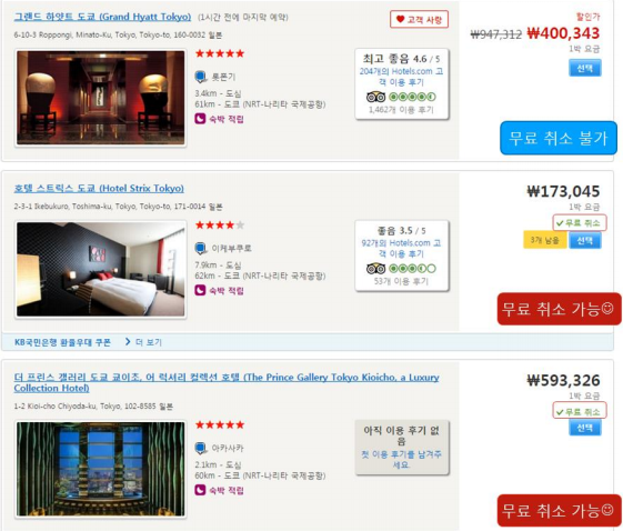 표시가 있는 호텔은 보통 체크인 하루 전까지 무료취소가 가능합니다. 하지만 호텔마다 정책이 다를 수 있으므로 반드시 무료 취소 가능한 날짜를 확인해야합니다.