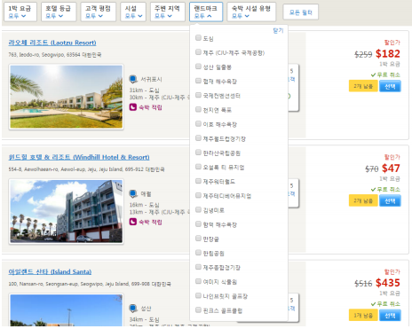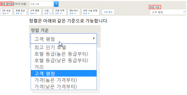 필터링 및 정렬 호텔스닷컴에서 검색시 상단에 있는 필터 및 정렬 메뉴입니다.
