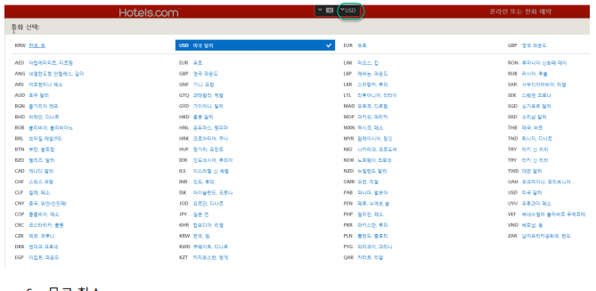 통화 설정 : 호텔스닷컴 상단 통화표시 KRW 을 클릭하시면 원하시는 통화로 바꾸실 수 있습니다.