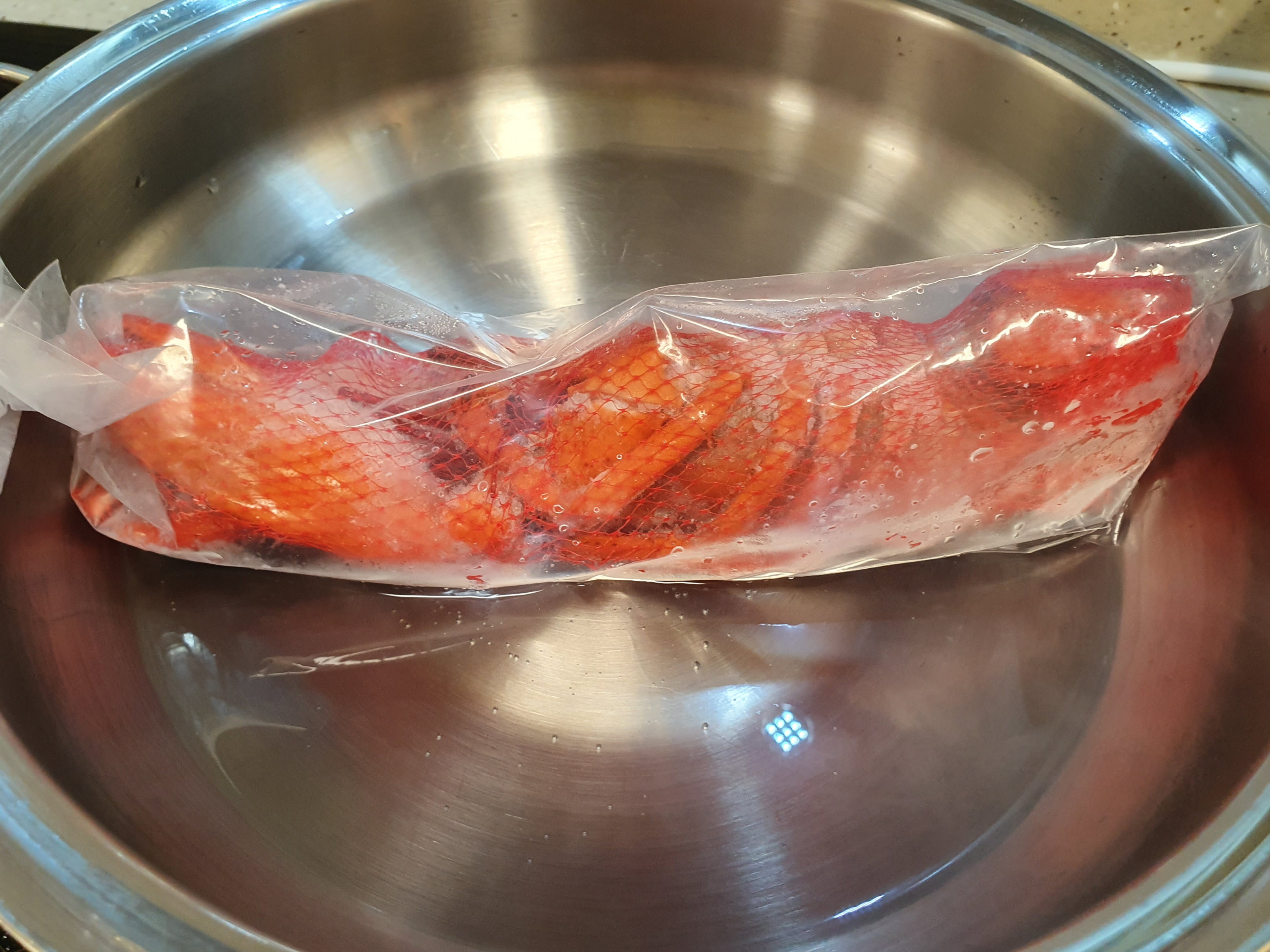 자숙랍스터는 빨리 해동하기 위해서 비닐채로 뜨거운 물에 넣었어요.