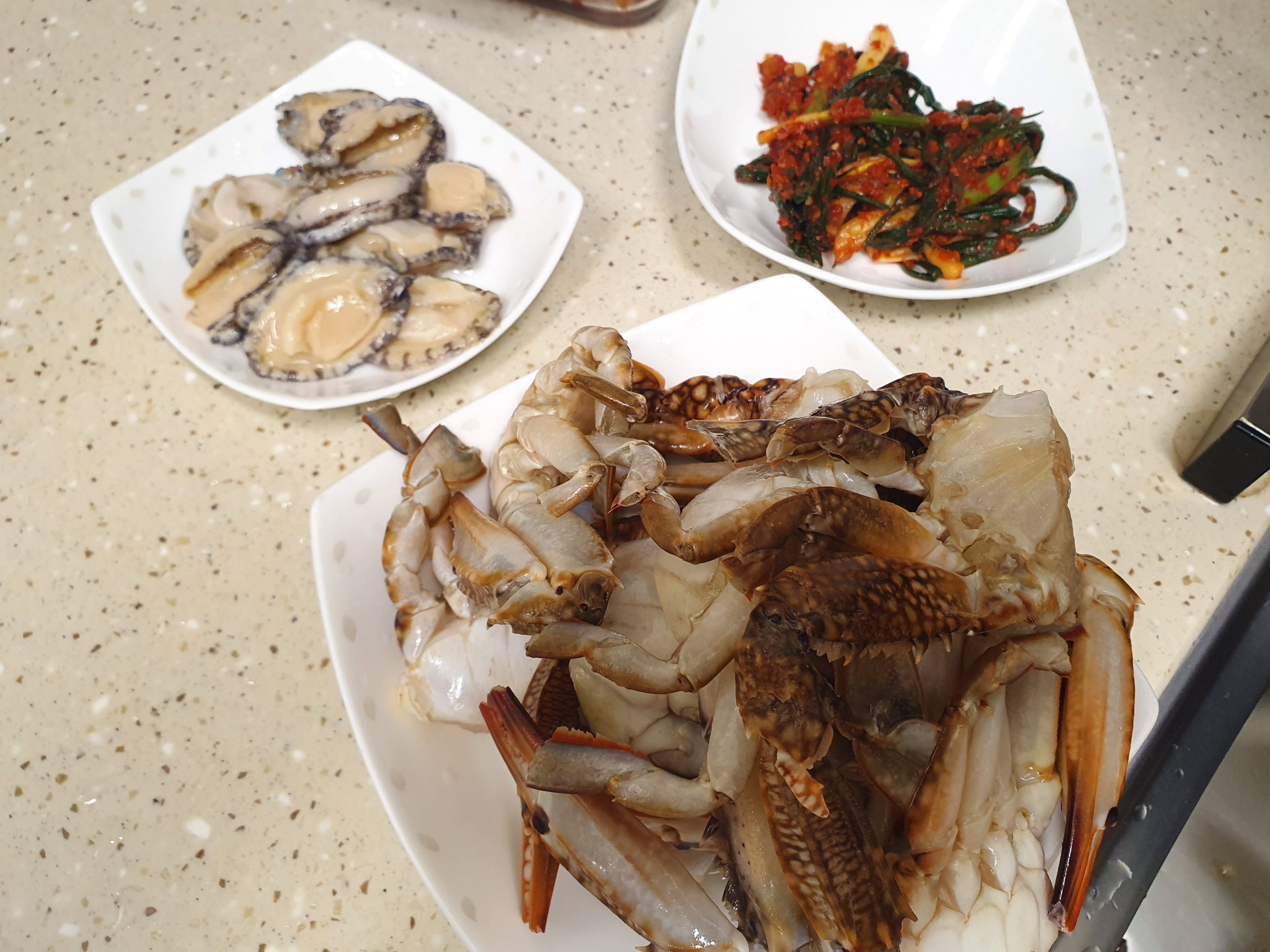 라면에 들어갈 꽃게, 전복, 파김치 입니다~~