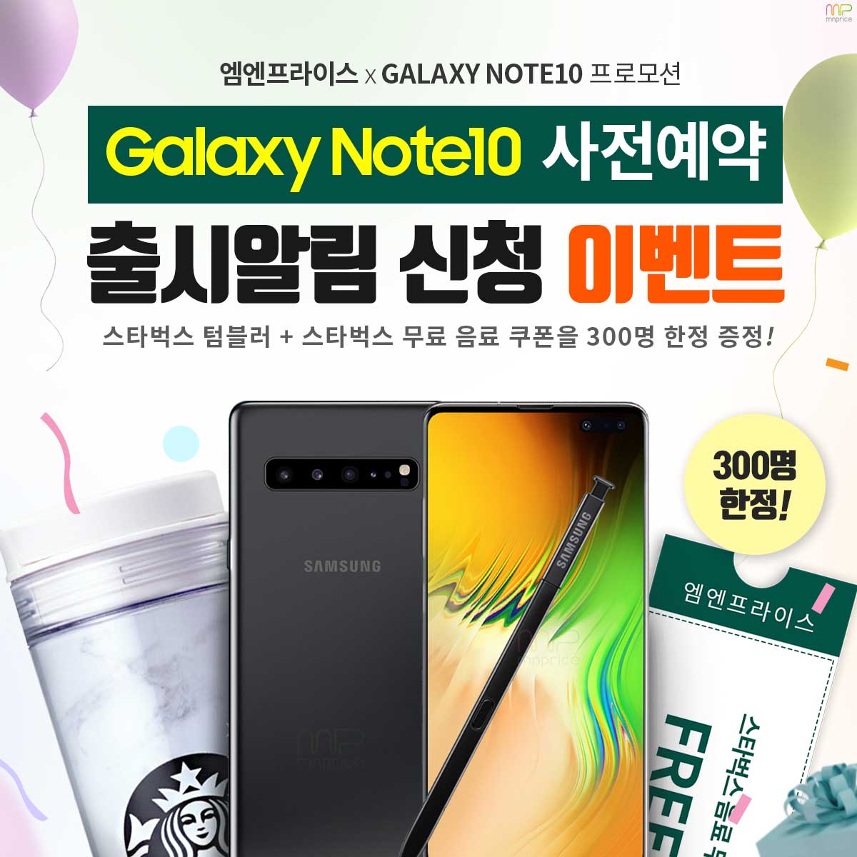 엠엔프라이스 X GALAXY NOTE10 프로모션을 빠르게 만나보는 방법 엠엔프라이스(mnprice.com) 사전예약 출시 알림 신청시 스타벅스 텀블러와 음료쿠폰을 쏩니다. ■ 갤럭시노트10 5G 사전예약 출시 증정/지원 혜택 - 25% 즉시결제 할인 + 22개월 무이자 혜택 (선착순 100명) - 엠엔프라이스만의 더 특별한 사은품 혜택 (추후 공개) - 제조사. 통신사 특별 증정 사은품 (추후 공개) - IPTV+인터넷 바꾸면 최대 40만원 +@ 혜택