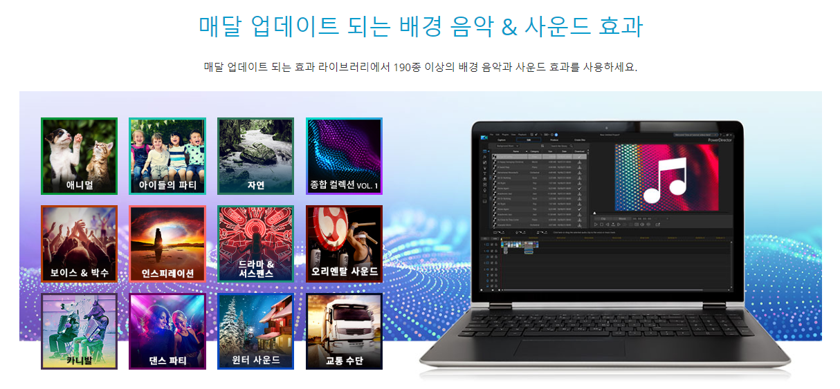 매달 업데이트 되는 음악 트랙파워디렉터 365 구독자에게는 190종 이상의 배경 음악과 480종 이상의 사운드 효과를 무료로 제공합니다.