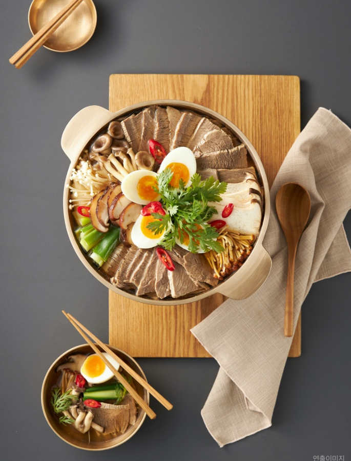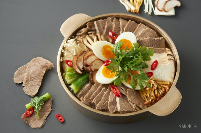 부드러운 소고기 수육과 다양한 버섯과 야채로 깊고 풍부한 평양식 전골요리