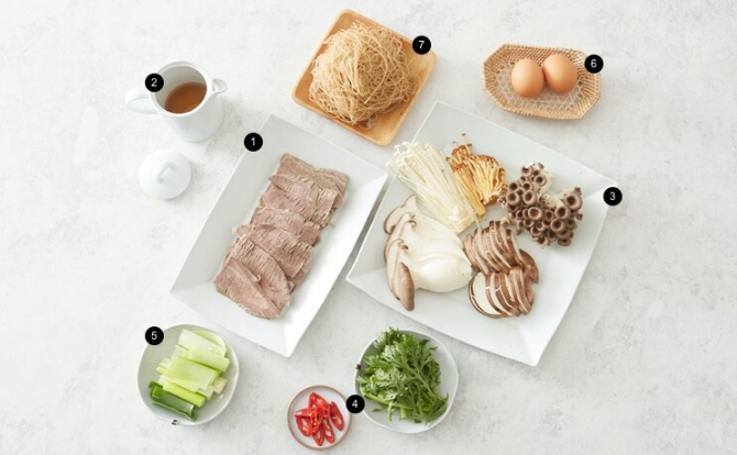 1.소양지수육 1팩 2.소고기농축소스 1팩 3.혼합버섯 [새송이버섯, 표고버섯, 애느타리버섯, 팽이버섯, 황금송이버섯] 1팩 4.혼합채소 [쑥갓, 홍고추] 1팩 5.대파 1팩 6.계란 2구 7.냉면사리 1팩