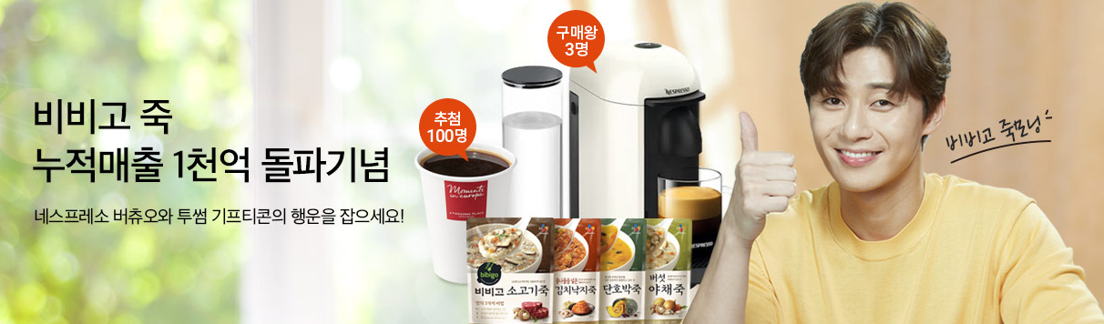 비비고 죽 구매고객에게 네스프레소 버츄오와 투썸 기프티콘의 모닝커피를