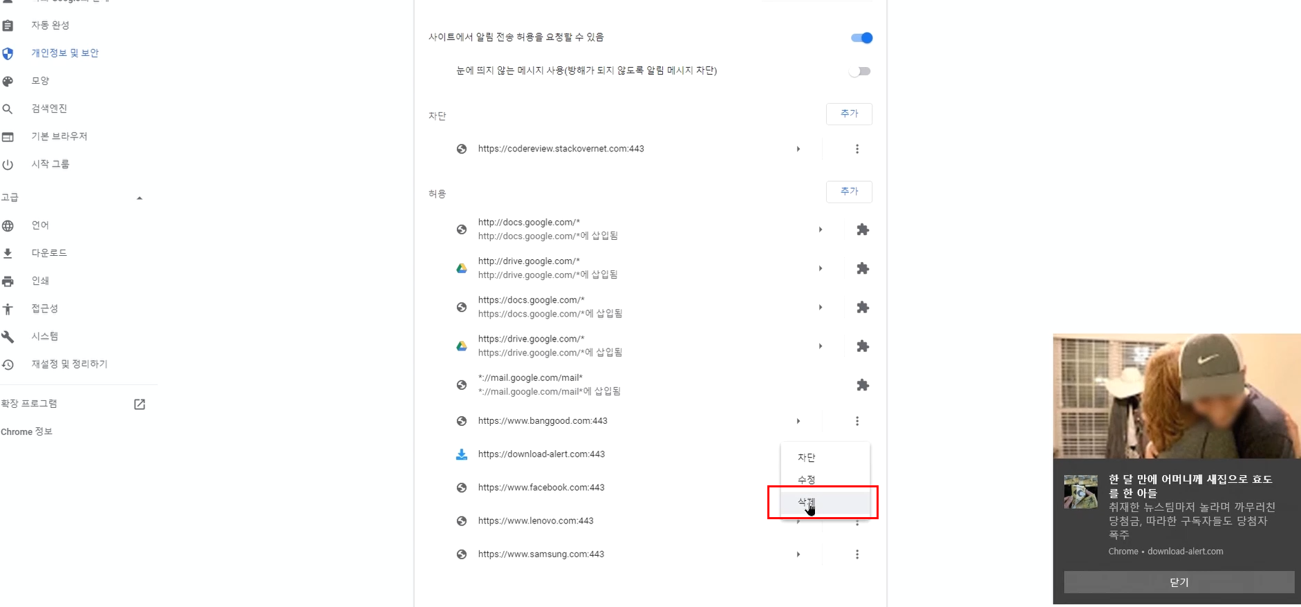 하셔도 되고, 아니면 모르는 사이트는 전부 차단이나 삭제를 하시면 되요.