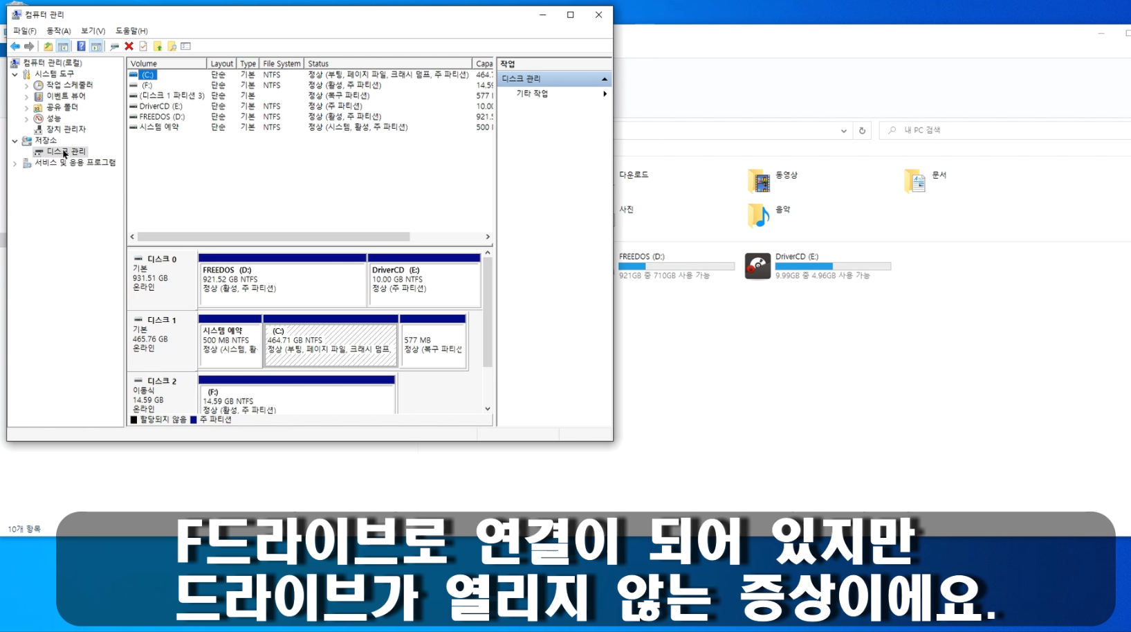 그 다음 디스크 관리를 선택하시면 실제로는 연결이 되어있지만