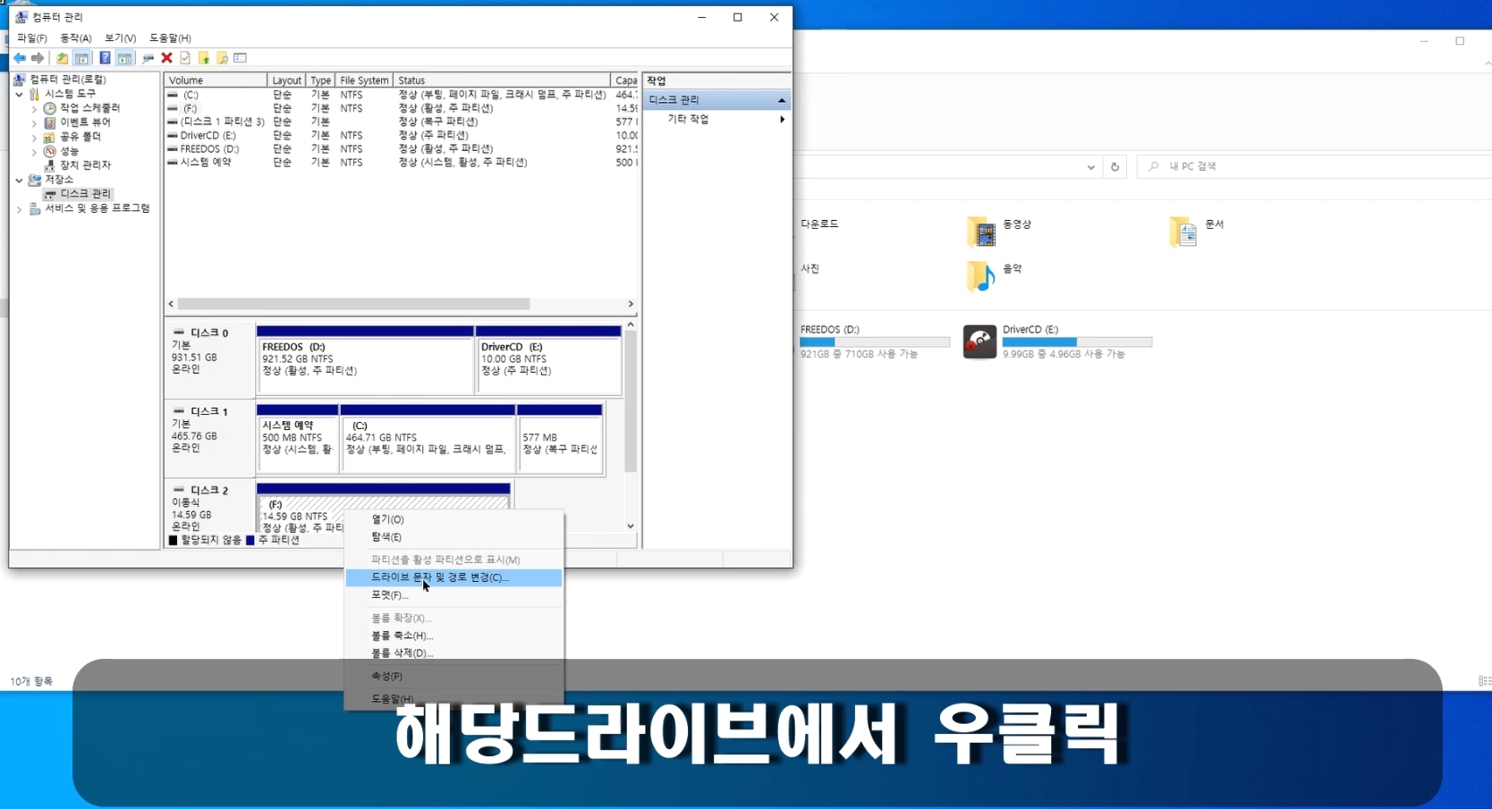 어떤 이유에서인지 해당 드라이브가 내컴퓨터에서 보이지 않는 경우가 있습니다.