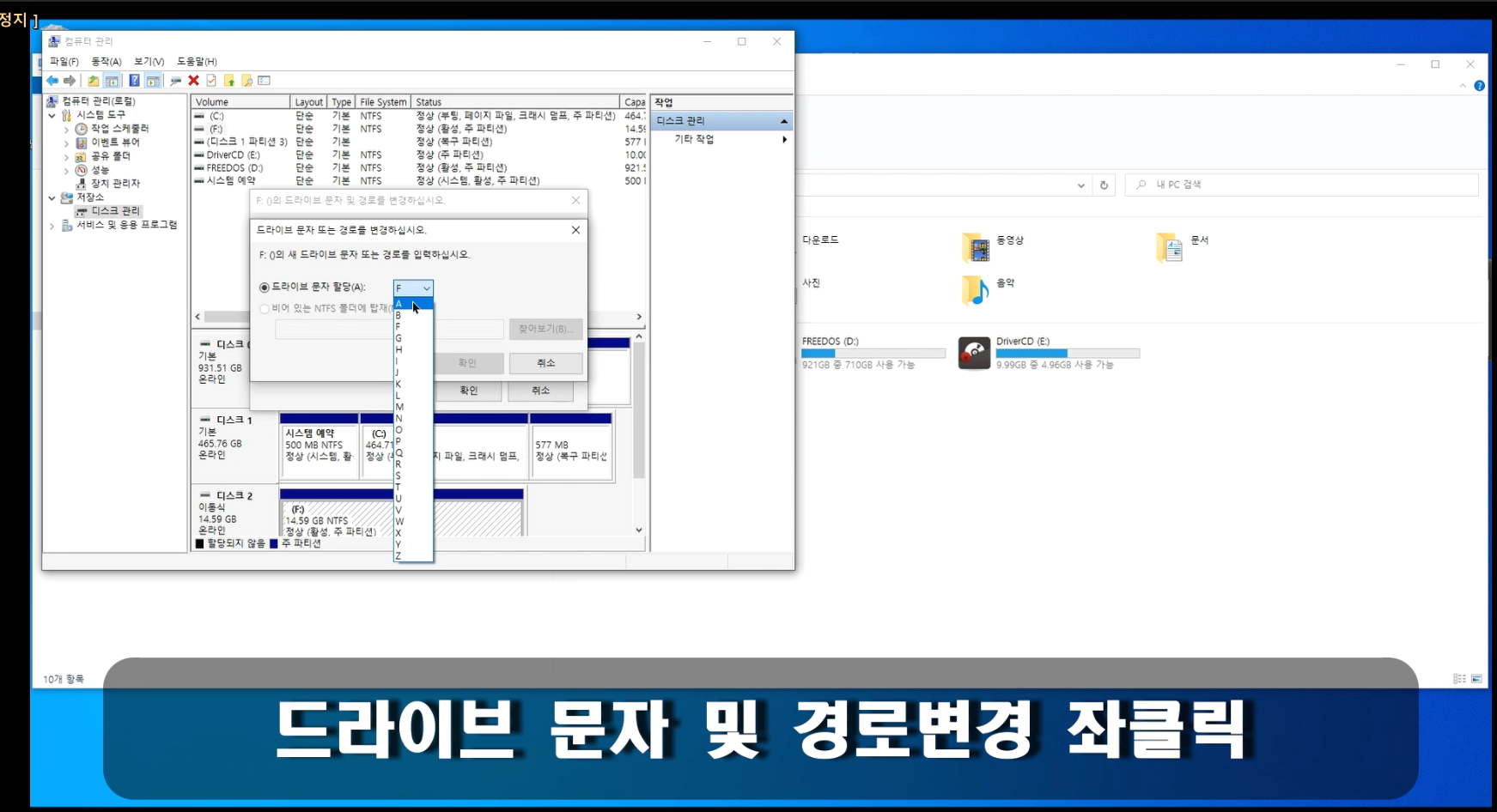 그럴 경우 드라이브 명을 A드라이로 변경해주면 내컴퓨터에서 드라이브가 보입니다.