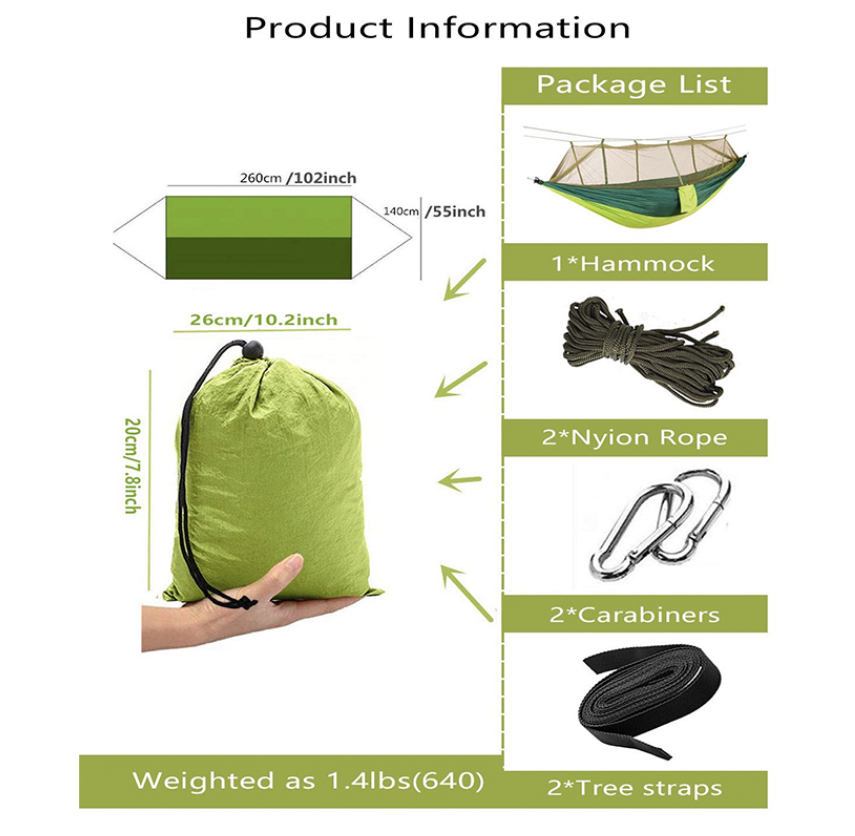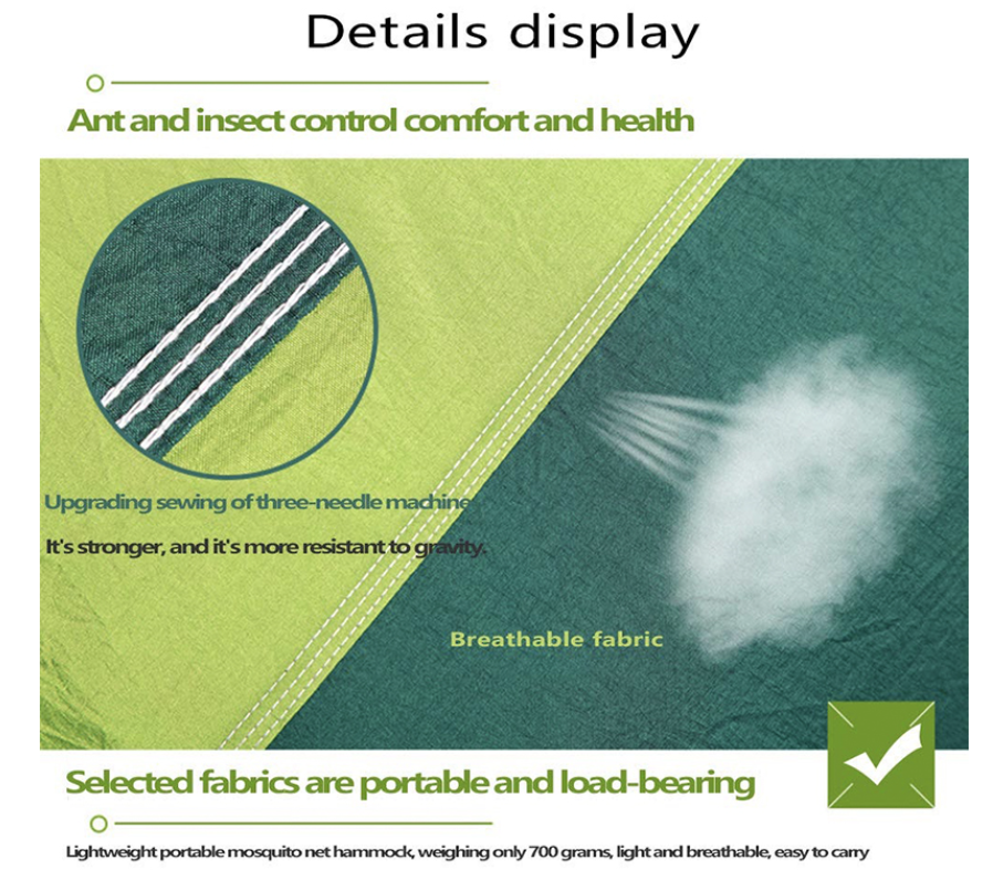 Made of high quality 210T parachute nylon materials Pretty strong, it can hold the weight up to 200Kg, special designed durable net fabric .This lightweight portable hammock durable.
