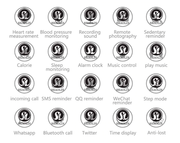 3. Bluetooth music; Heart rate monitor; measuring blood pressure; Sleep monitor; Sedentary reminder; Pedometer; Sound Recorder; Alarm and Stop Watch; Time Synchronization.
