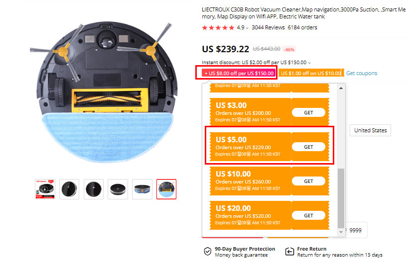 쿠폰 리스트에서 스크롤을 내리면 Orders over US $229.00 이라고 되어 있는 쿠폰의 Get을 클릭하세요.