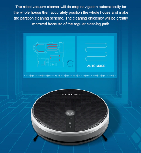 1. The robot can detect the entire environment around and then build up the map inside the CPU so that it do cleaning with plan from one room after another.