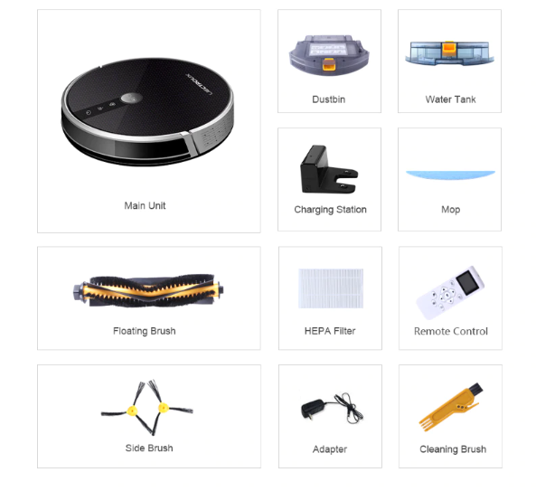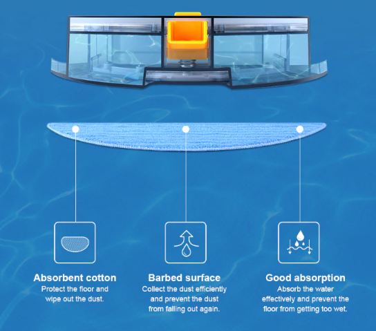 6. Electric control water tank ensures even water seepage. The water seepage stops automatically if robot stops working. The huge water volume of 350ml ensures continous wet mopping up to 100 minutes.