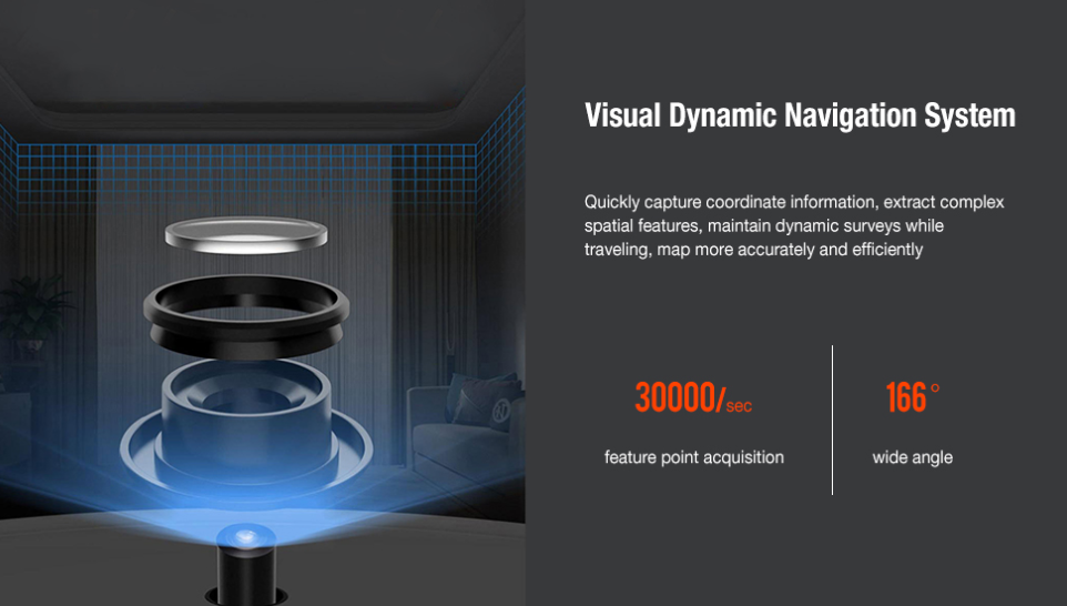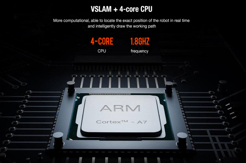 ● VSLAM + 4-core CPU More computational, able to locate the exact position of the robot in real time and intelligently draw the working path.