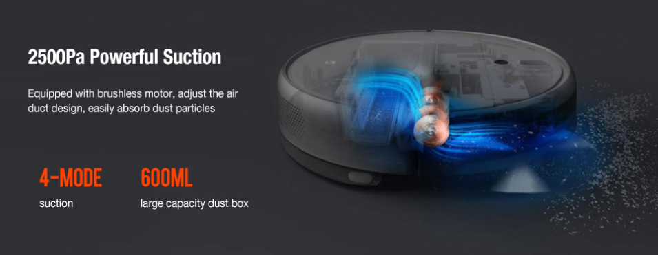 ● 2500Pa Powerful Suction Equipped with brushless motor, adjust the air duct design, easily absorb dust particles.