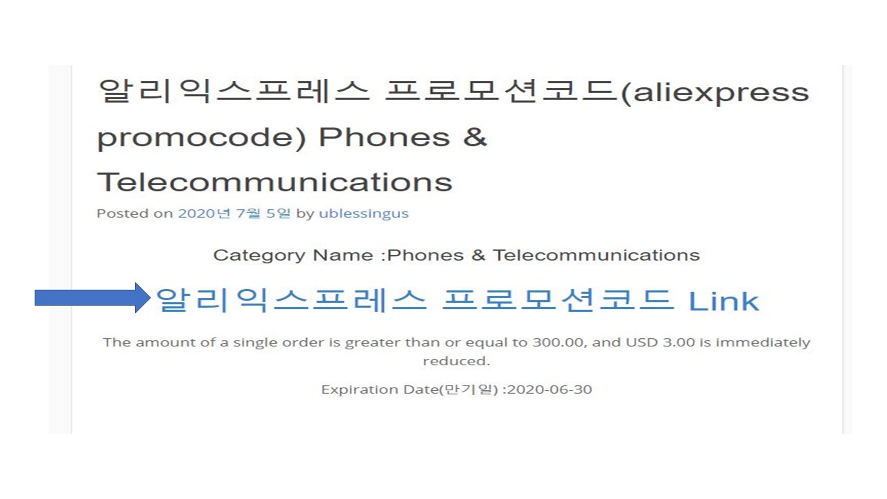 Category Name :Phones & Telecommunications 알리익스프레스 프로모션코드 Link The amount of a single order is greater than or equal to 300.00, and USD 3.00 is immediately reduced. Expiration Date(만기일) :2020-06-30 링크를 클릭하시면