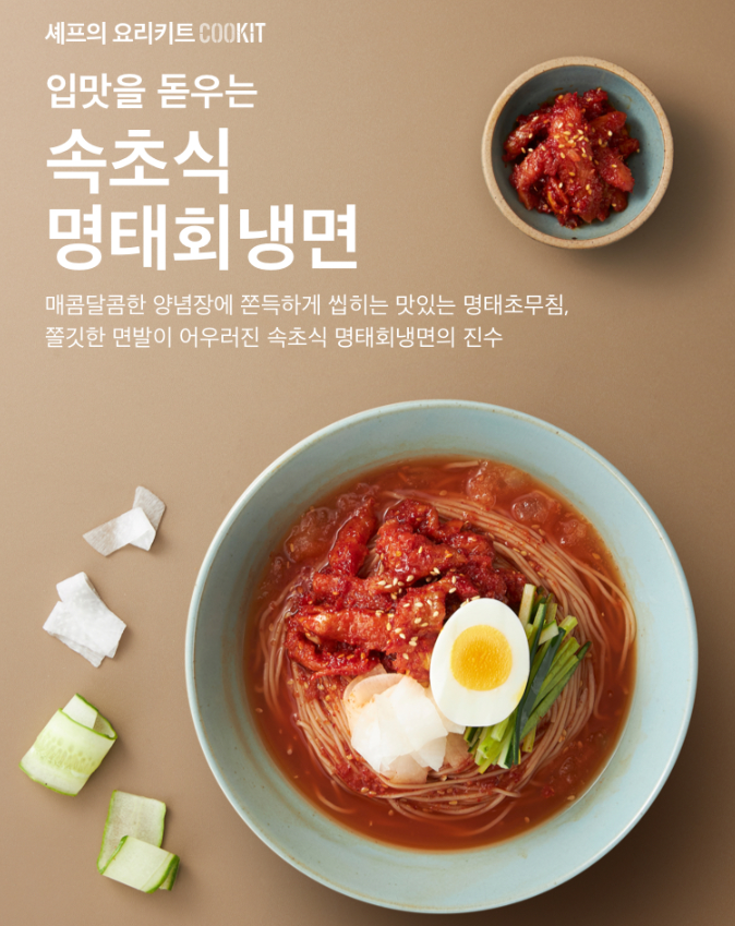 함경도와 강원도 일대에서 바닷가에서 잡히는 신선한 어류로 회를 떠서 갖은 양념에 무쳐 얹어 먹기 시작하면서 이제 모두가 즐기는 별미가 되었죠. 더운 날씨, 요리과정은 간편하면서도 입맛을 돋우는 메뉴가 생각난다면 바로 이 메뉴를 추천드립니다. 메밀이 배합된 쫄깃하고 탱탱한 면발에, 간이 잘 밴 명태초무침의 새콤달콤함이 어우러진 COOKIT의 명태회냉면을 즐겨보세요.