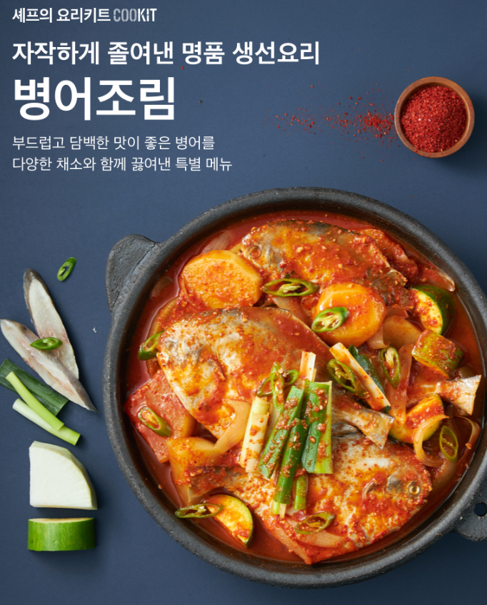 병어는 농어목 병어과의 바닷물고기로 비린내가 적으며 맛이 담백하고 살이 연해 회, 구이, 조림, 찜, 등으로 다양하게 요리할 수 있는 고급 생선인데요. 쿡킷이 선보이는 "병어조림"은 부드럽고 담백한 맛이 좋은 병어를 시원한 멸치다시마육수와 칼칼한 양념을 넣어 맛을 낸 국물에 넣고 무, 감자, 양파, 대파 등 다양한 채소와 함께 끓여내 자작한 국물과 함께 풍성하게 즐기실 수 있는 특별 메뉴에요.