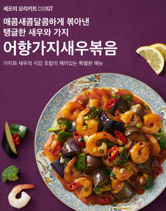 '어향(魚香)'은 중국 사천지방 요리의 다섯 가지 향미 가운데 하나로, 생선을 넣지 않고도 여러 가지 양념으로 생선 향을 내는 것이 특징인데요. 쿡킷의 '어향가지새우볶음'은 매콤한 맛과 짠맛, 단맛, 신맛이 완벽하게 조화를 이루는 어향소스에 촉촉하고 부드러운 가지의 담백함과 탱글하게 씹히는 새우의 식감 조합이 재미있는 특별한 메뉴입니다.