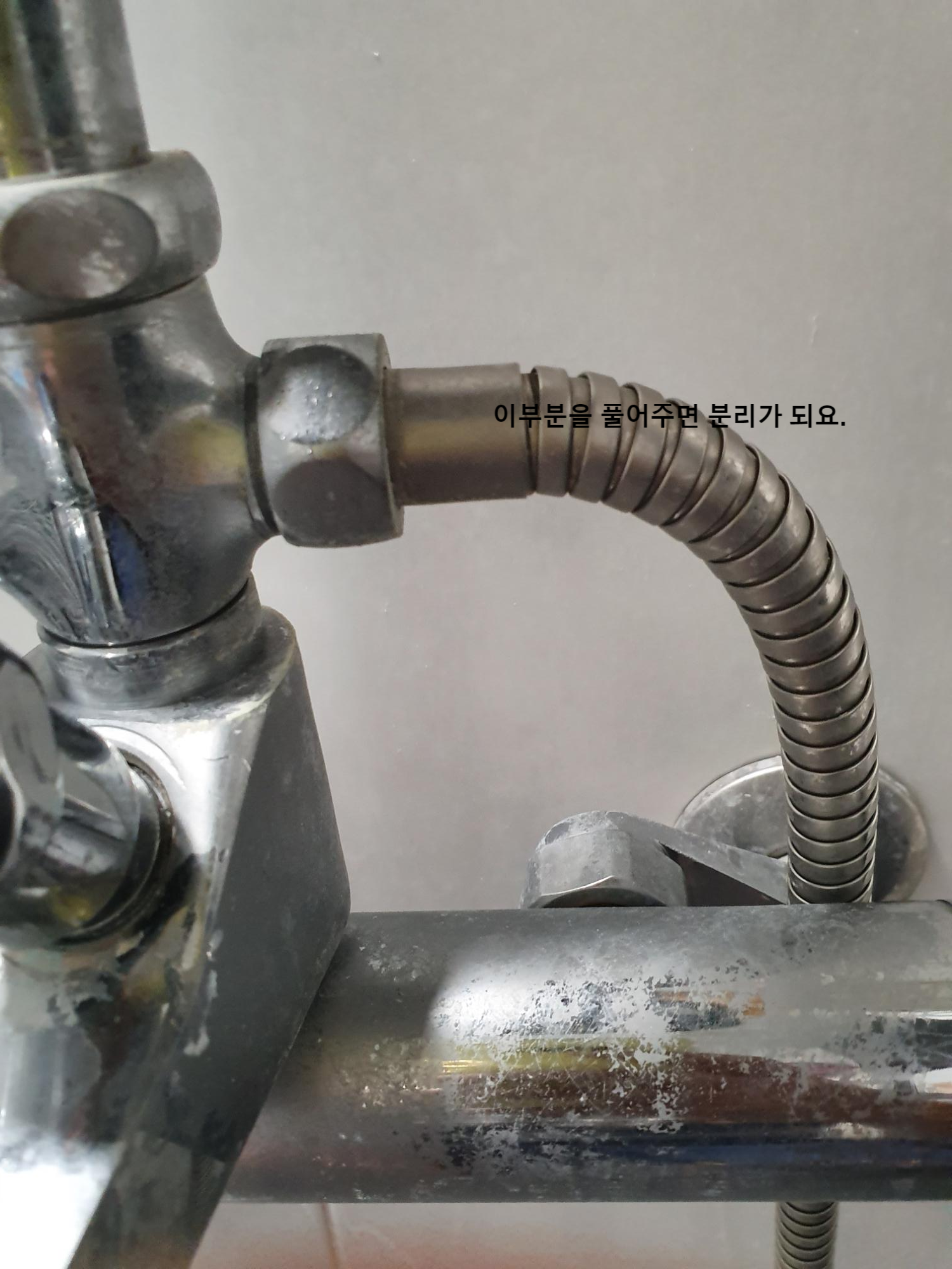 짠~~이렇게 연결을 했답니다. 길이는 기존것은 1.5m이었는데 디클린 샤워호수는 2m이라 좀 길어요.