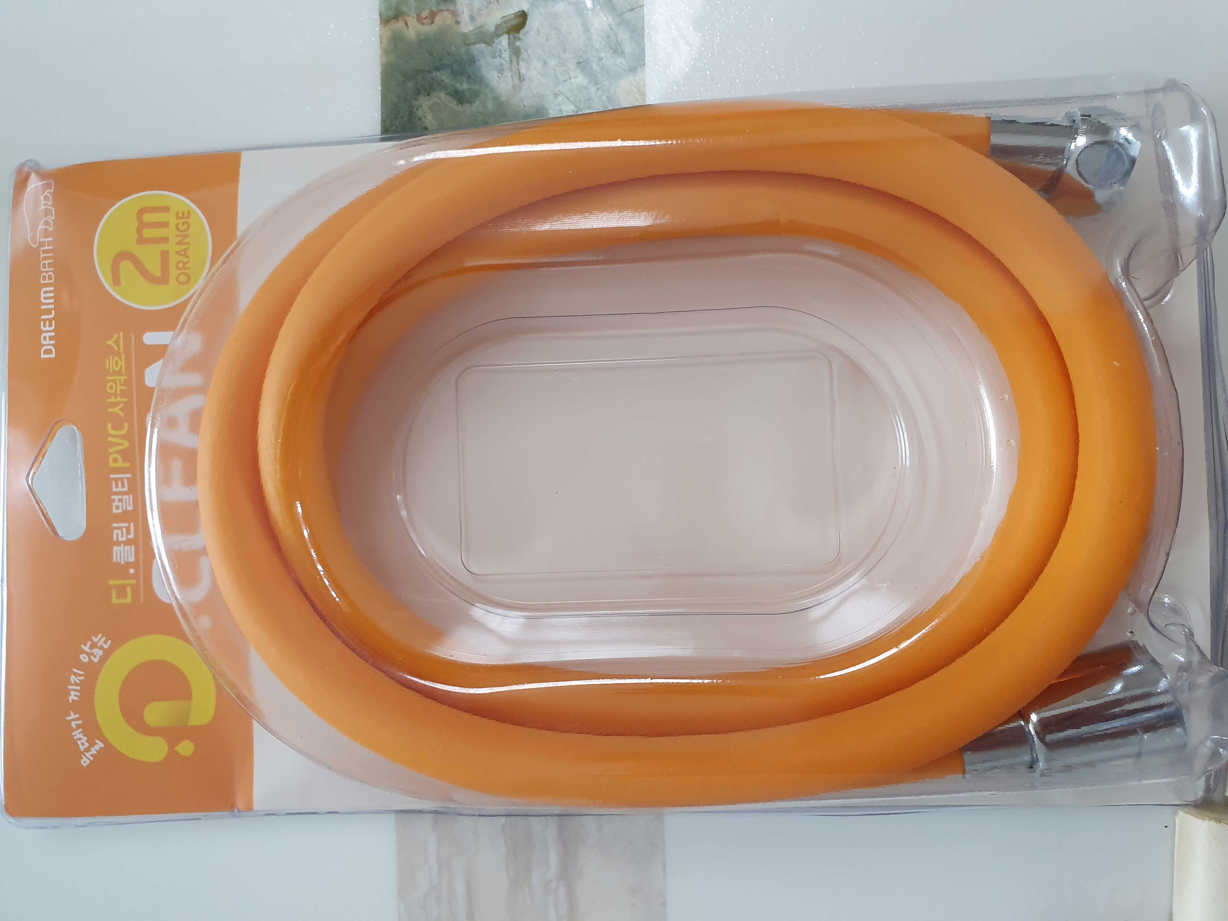 그리고 이마트에서 공수한 디클린 멀티PVC샤워호수에요. 색상은 오렌지, 핑크, 실버, 블랙이 있었지만 샤워헤드 손잡이가 노란 색이라서 호수도 노란색으로 구매했어요.(혹시 이글을 보고 구매하시는 분들은 오렌지색 사지마세요...싫어하더라구요...)