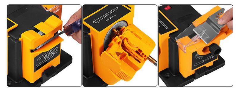 1. SS drill sharpener: Sharpens high speed steel drill bits from 3mm to 10mm/13mm.