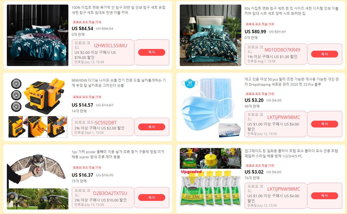 알리익스프레스 프로모션 코드는 상품마다 할인율이 다르고 어떤 상품들은 코드대신 쿠폰으로