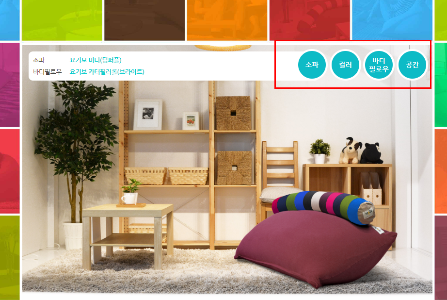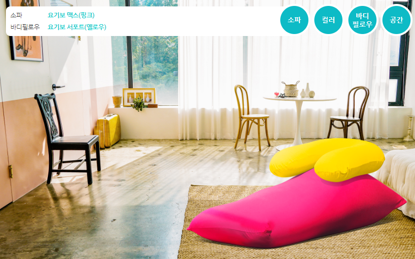 오른쪽 상단에 보시면 소파 컬러 바디필로우 공간 이라는 버튼이 보이는데,