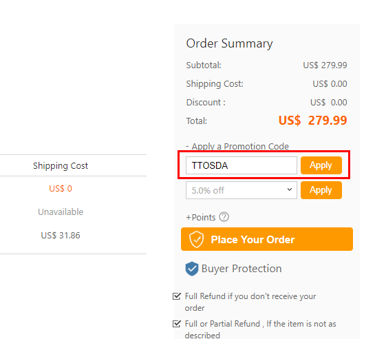 TOMTOP에서 배포한 프로모션코드로 할인코드와 같은 개념이에요.