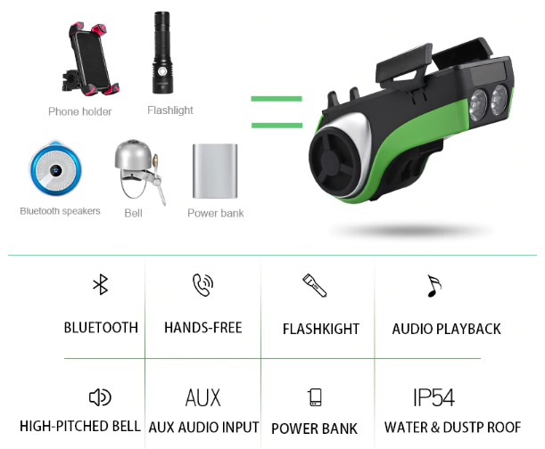*Bluetooth V4.0 + Speaker+Power Bank+Bike Light+Bicycle Bell+Iphone Bracket.