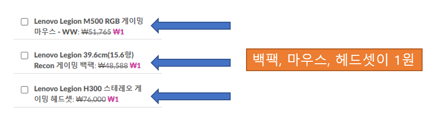 오른쪽 아래쯤에 게이밍 마우스, 게이밍 백팩, 헤드셋이 1원으로 되어있어요.