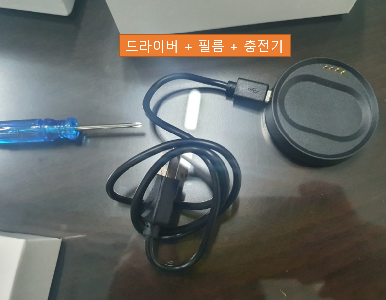 스마트워치 하단에는 드라이버, 필름, 충전기 등의 구성품이 들어있어요.