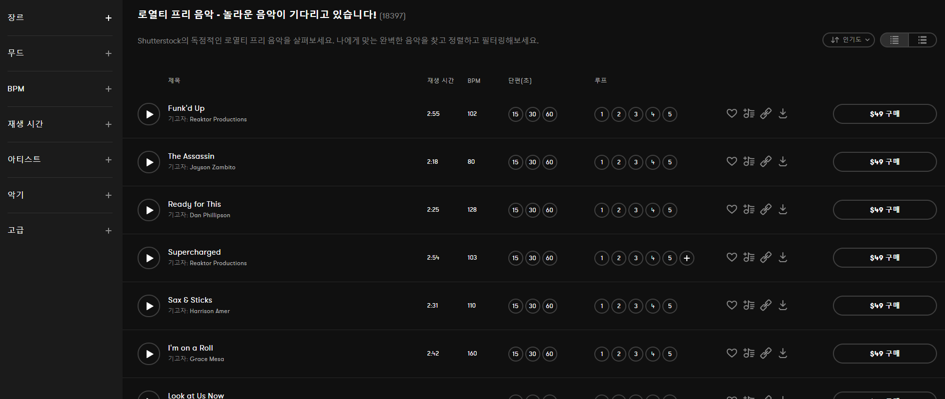 모든 트랙에는 미리 듣기 및 구간 반복이 포함되어 있어 모든 프로젝트에 맞춰 사용할 수 있습니다.