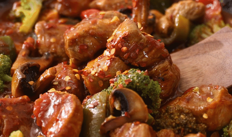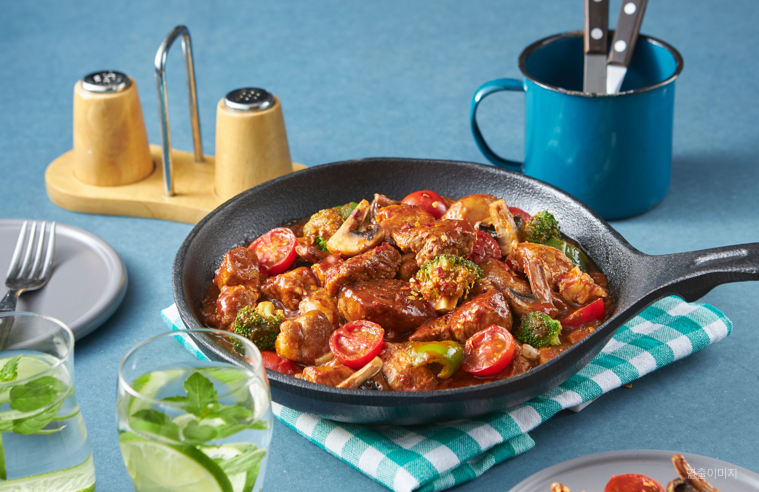 도톰한 목살과 한입에 먹기 좋게 썰어진 다양한 채소를 함께 볶아내 남녀노소 가리지 않고 맛있게 먹을 수 있는 '폭찹스테이크'에요.찹스테이크 소스에 토마토의 맛을 더하고 크러쉬드레드페퍼 등 쿡킷만의 비법으로 풍미를 살렸답니다. 맛도 좋고 보기에도 너무 예쁜 폭찹스테이크로 집에서도 수준 높은 요리를 즐겨보세요!