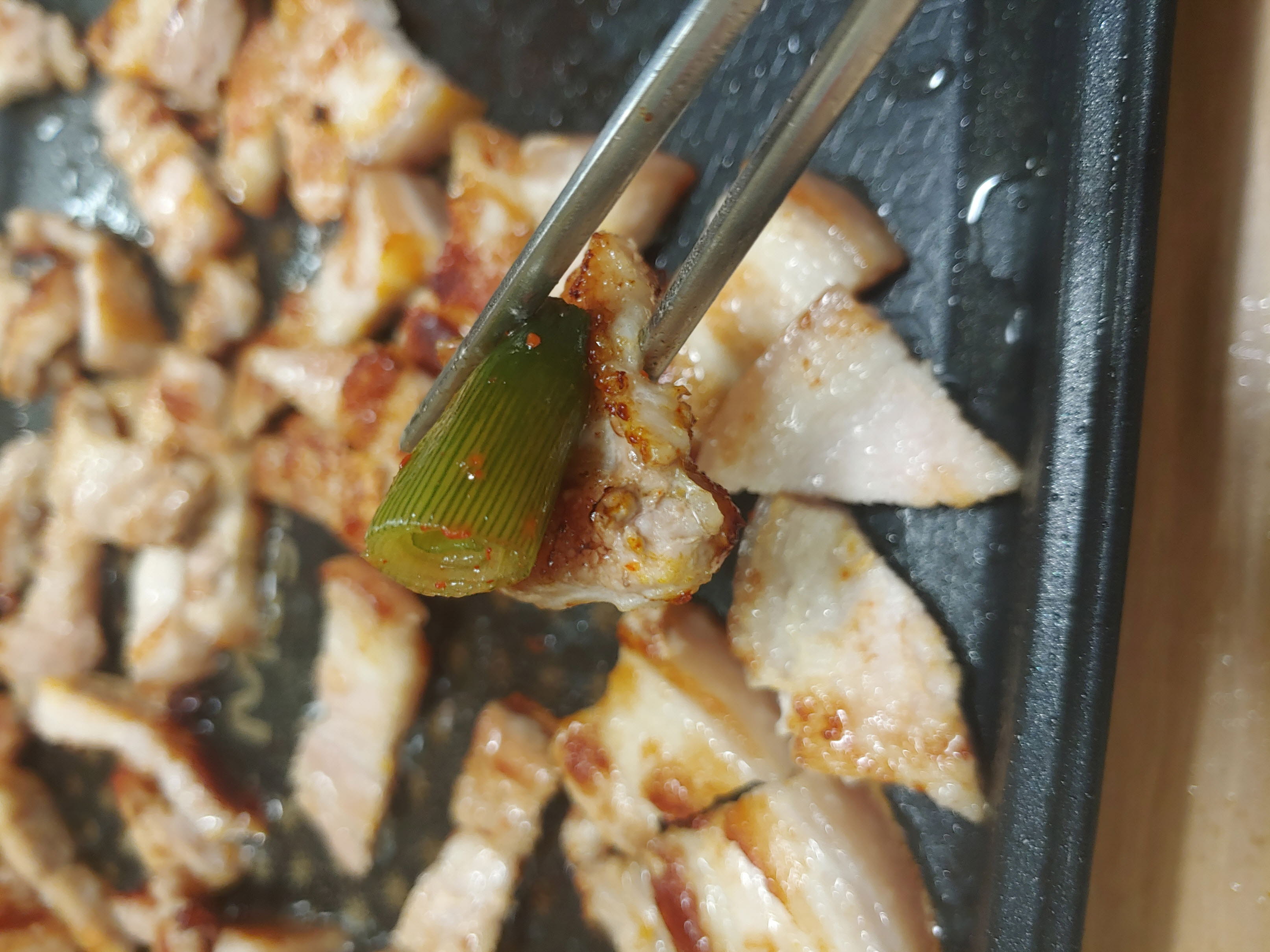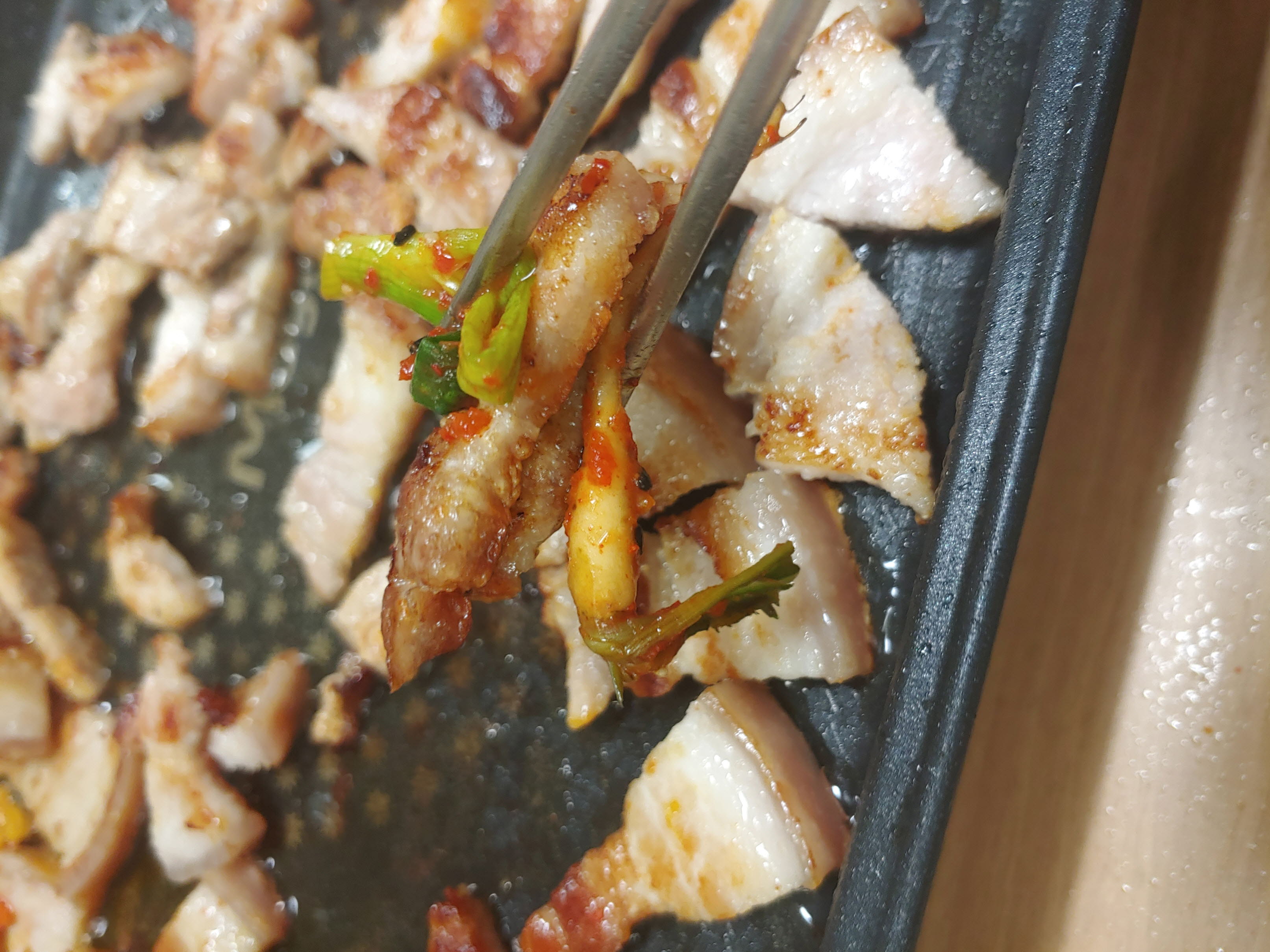 삼겹살은 역시 파김치에 싸먹어야 맛있는 것 같아요.