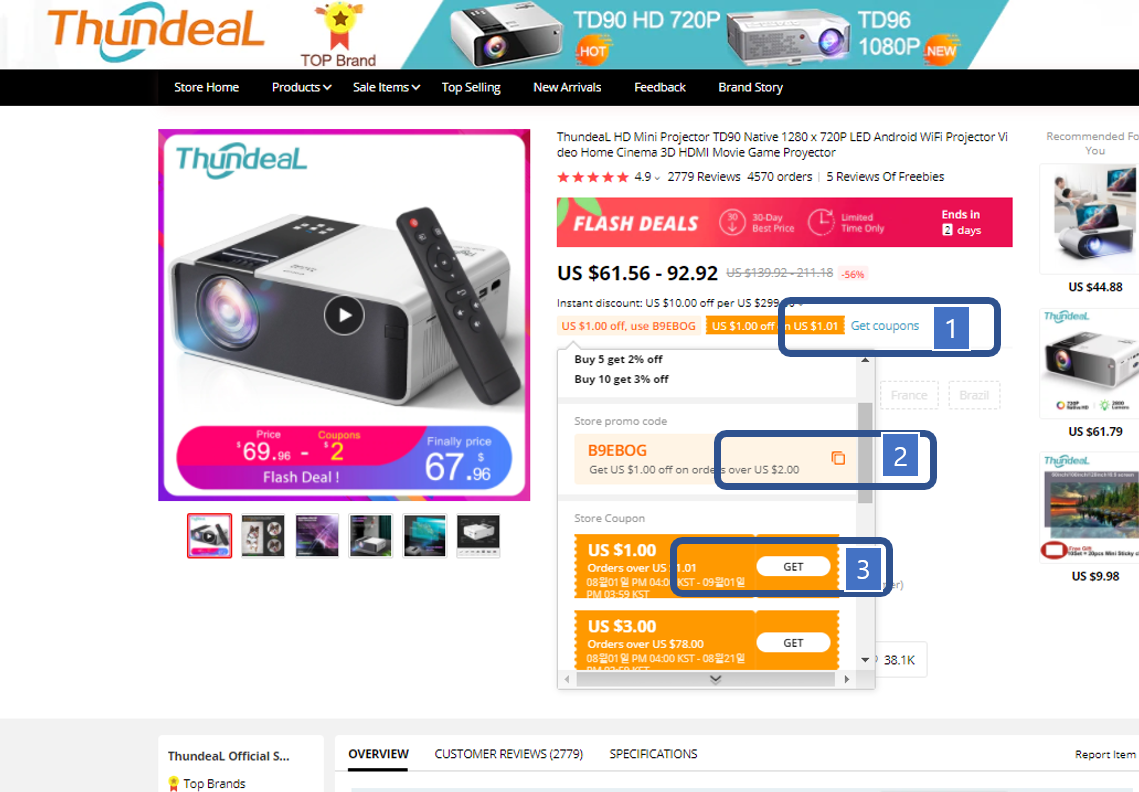거기서 오른쪽 Get Coupons를 클릭하시고 1,2,3 순서데로 클릭을 하세요.
