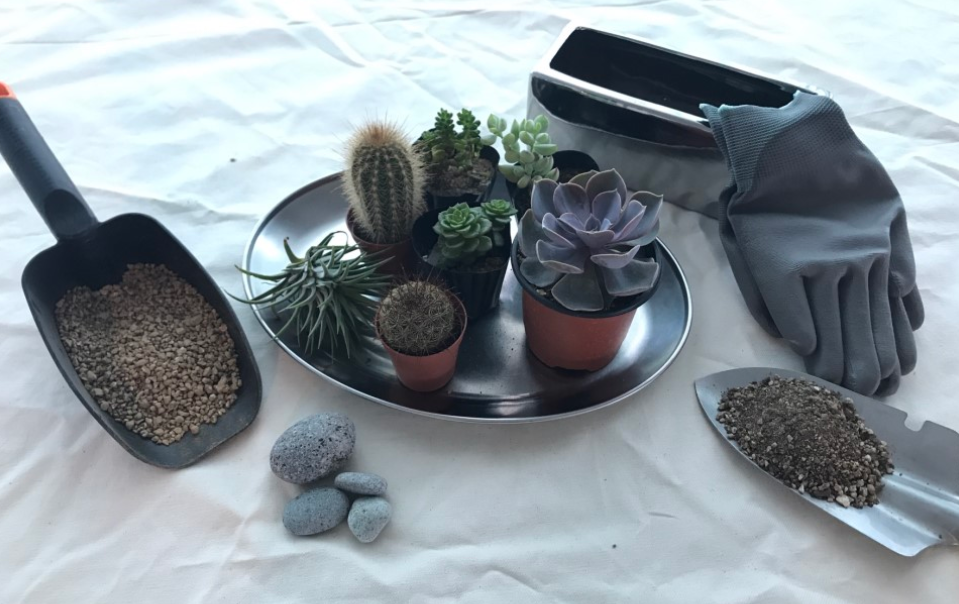 미니 가드닝의 준비물은 마사토, 데코용 에그스톤, 다양한 다육식물, 화기,