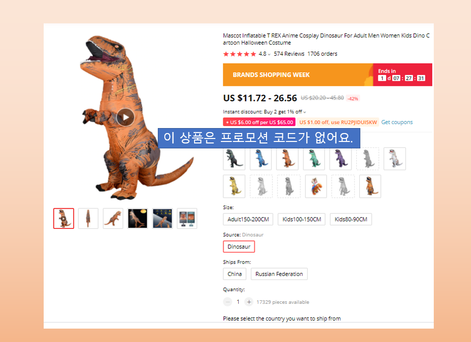 참고로 구매한 공룡인형 장난감은 사람이 들어갈수 있는 크기인데, 프로모션코드 쿠폰이 없어서