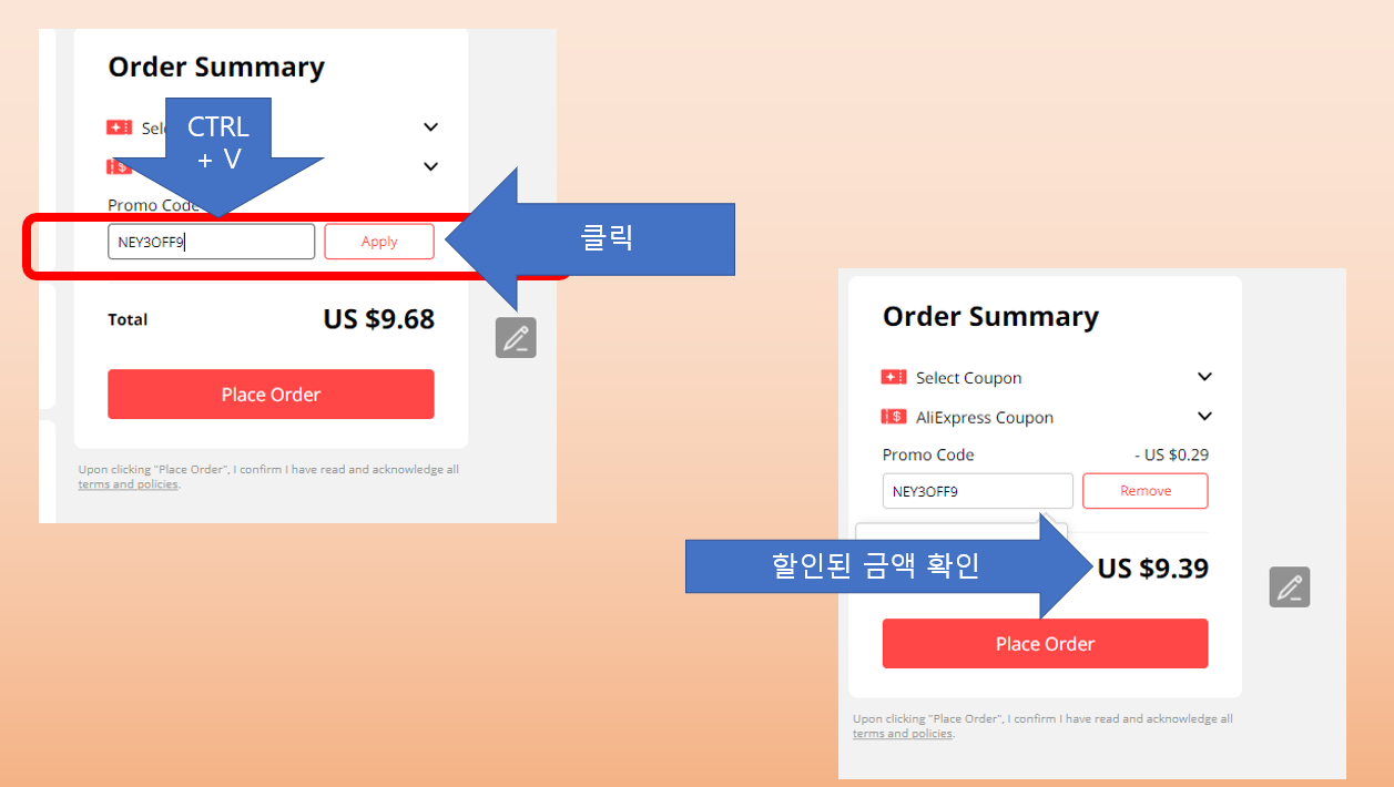 결제창 오른족에 Promo Code라고 되어 있는 곳에 CTRL+V하셔서 붙혀넣기 하시고 Apply를 클릭하시면