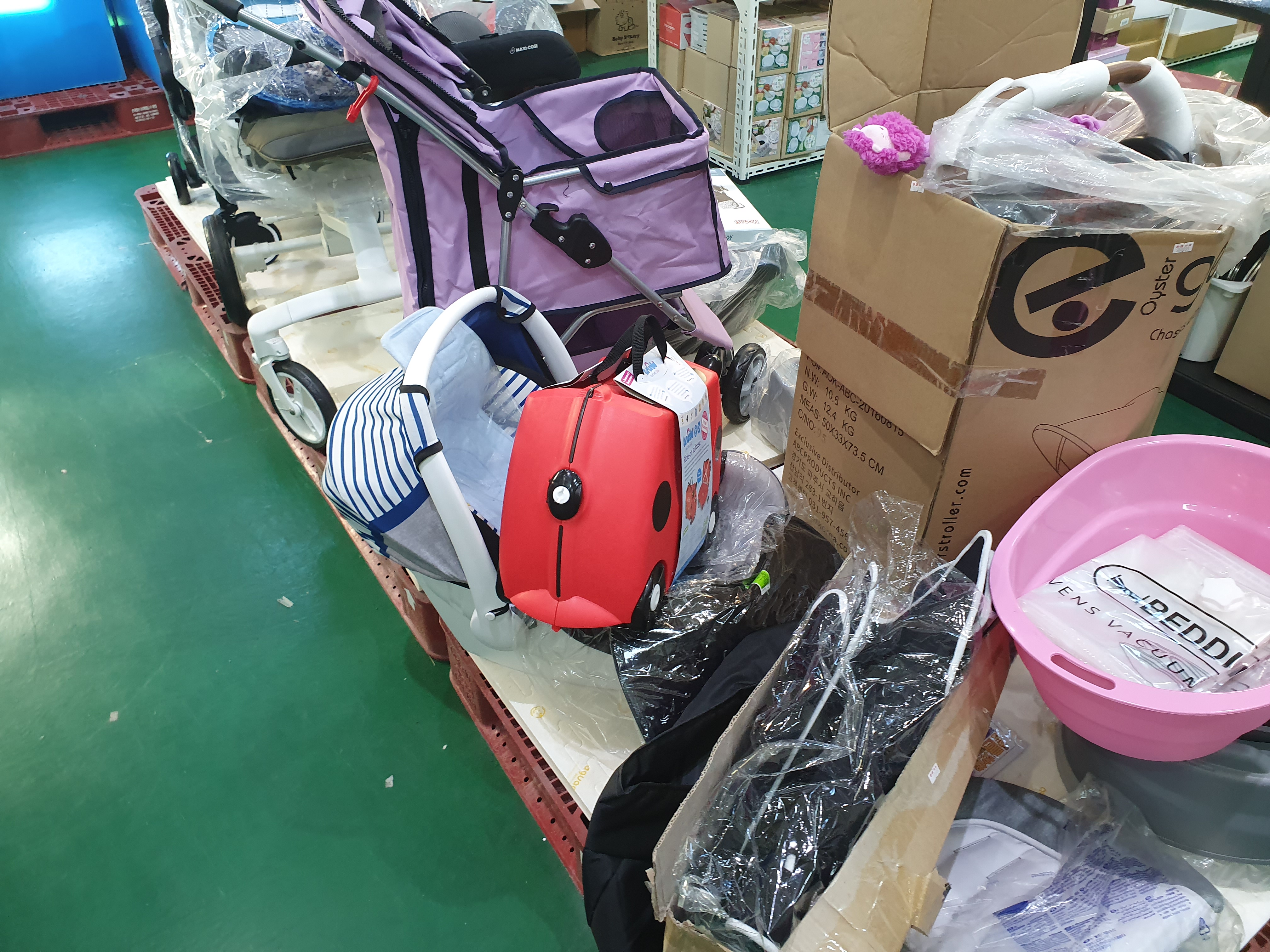 아이들 전동 오토바이, 자전거 등이 보여요, 면도기, 유아용 카시트 등등..