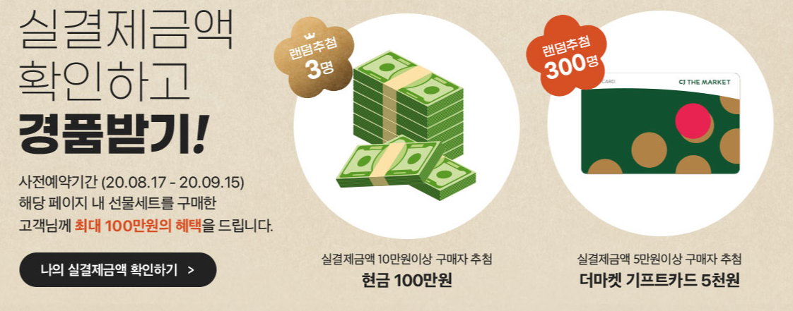 9월 15일까지 선물세트를 구매하시면 최대 100만원의 혜택을 드린다고 하네요.