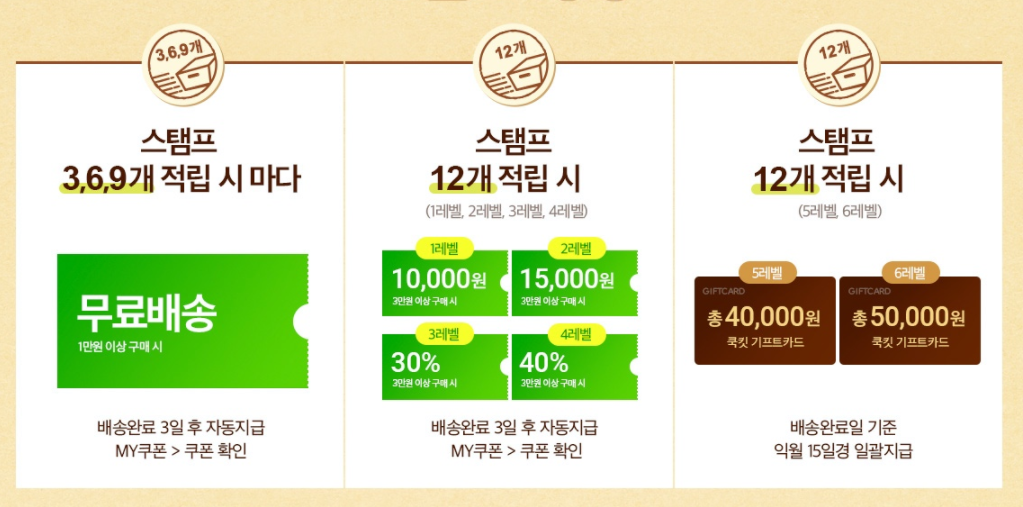 3,6,9 스탬프 적립할때마다 무료배송을 해드리고 12개 적립시 다양한 할인쿠폰을 드리는 행사에요.