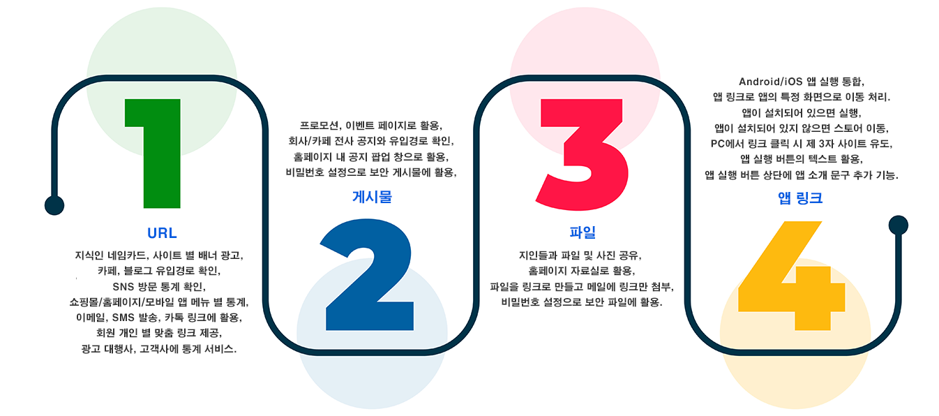 URL, 게시물, 파일, 앱, 버튼목록, 카드목록 링크 등 다양한 컨텐츠를 짧은 링크로 만들고 활용해 보세요.