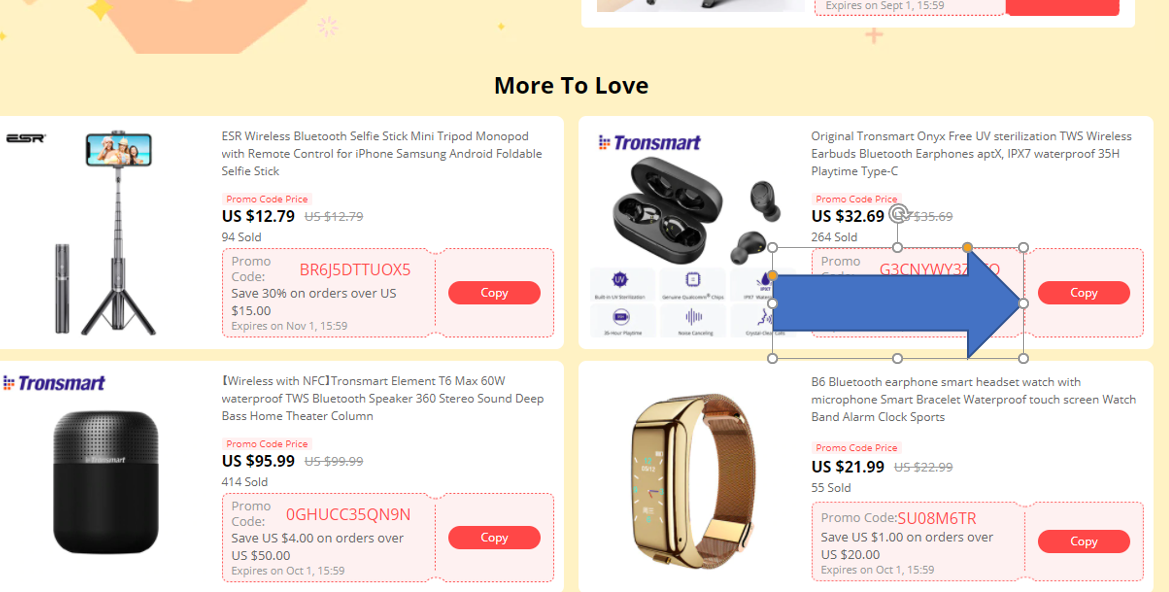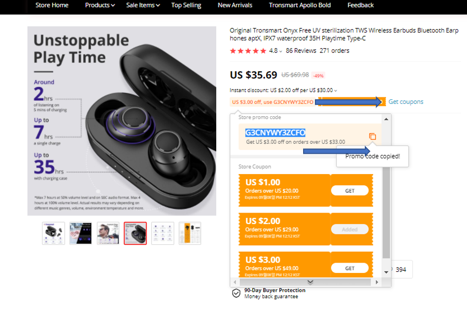 위의 링크로 들어가시면 상품리스트가 나오는데 거기서 Tronsmart 블루투스 이어폰에서 Copy를 클릭하시면