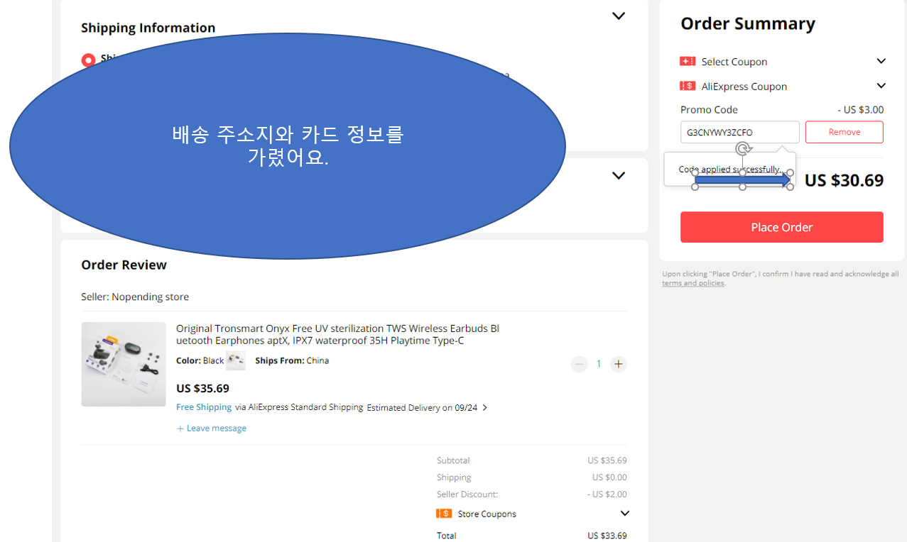 알리익스프레스 프로모션 코드 로 할인 받아 구매를 했어요.